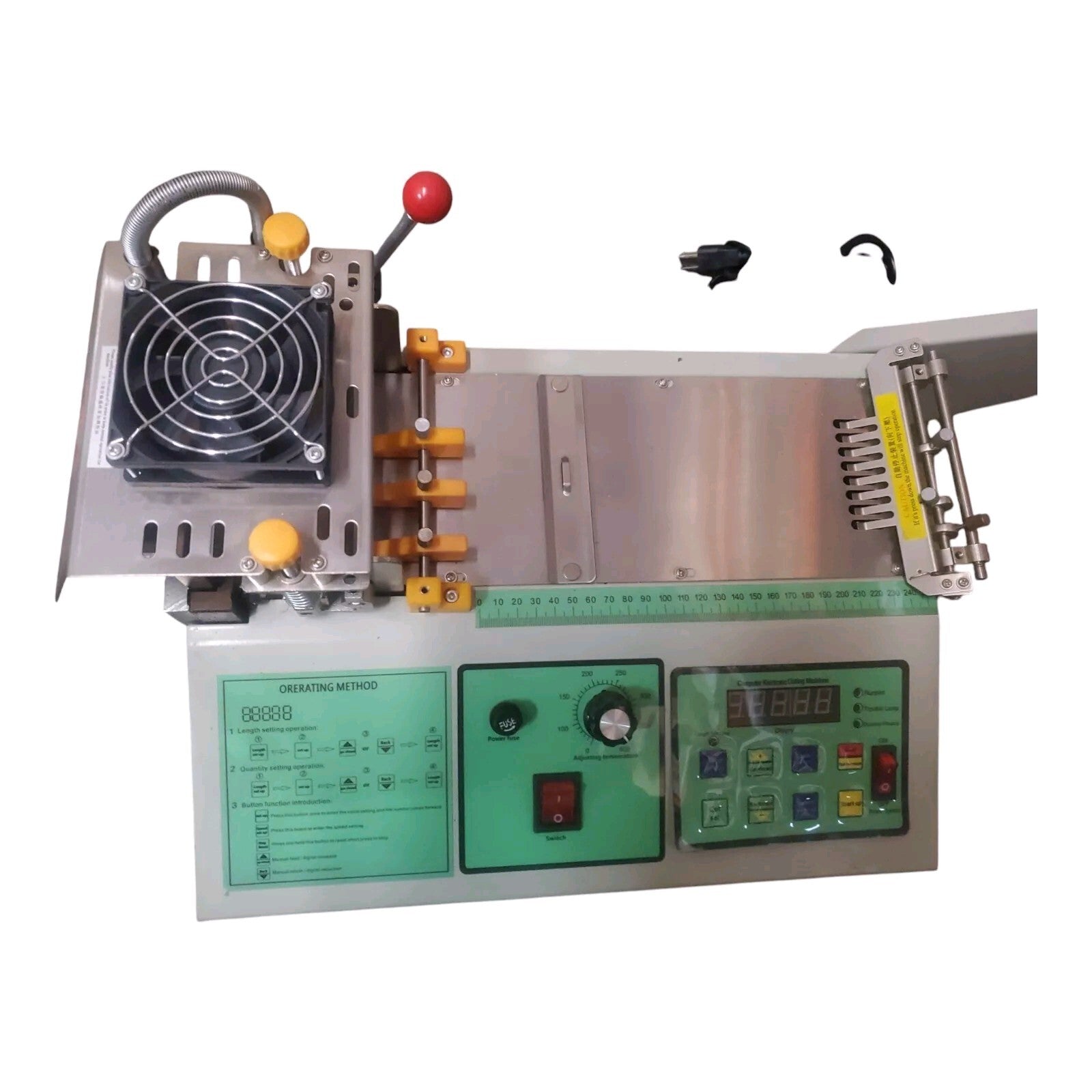 This is an automatic hot and cold cutter suitable for cutting webbing tape and textile ribbons. It has a cutting length range of 1-99999 mm and a cutting speed of 60-120 pcs/min (taking 50mm as an example). The blade has a maximum temperature of 350 ° C and the equipment is powered by 280W. It is made of high quality material
